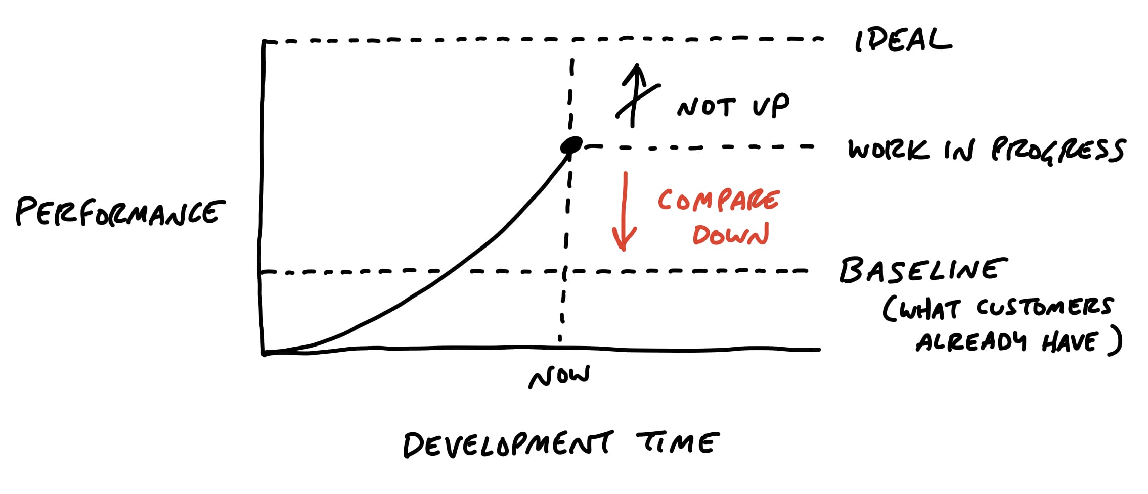 It helps to shift the point of comparison. Instead of comparing up against the ideal, compare down to baseline—the current reality for customers. How do customers solve this problem today, without this feature? What’s the frustrating workaround that this feature eliminates? How much longer should customers put up with something that doesn’t work or wait for a solution because we aren’t sure if design A might be better than design B?