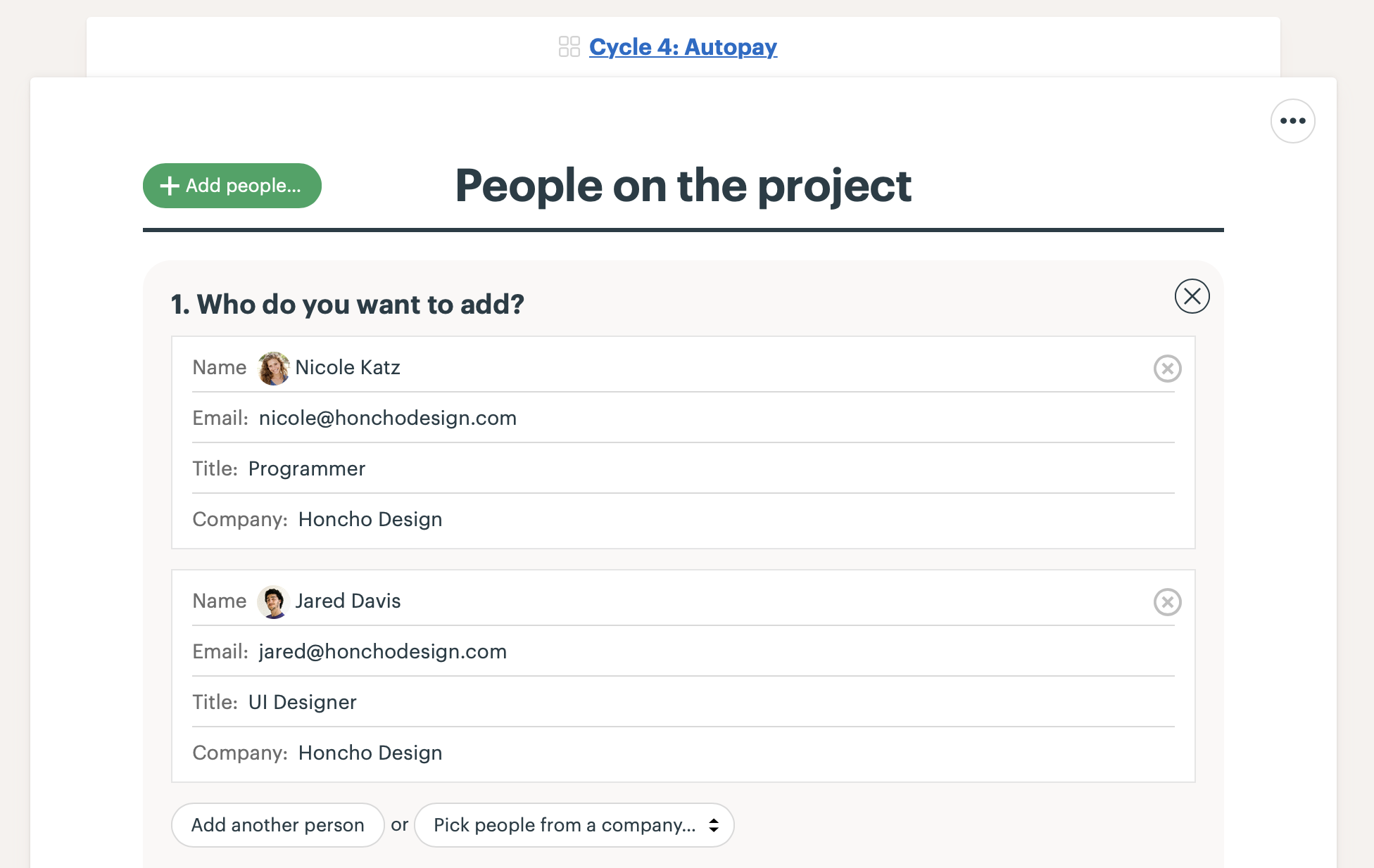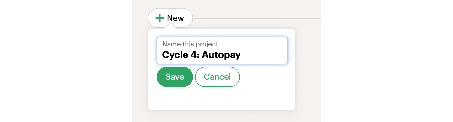 - Create a Basecamp Project for each project in the six-week cycle. We usually prepend a name or number for the cycle like this: “Cycle 4: Autopay.”