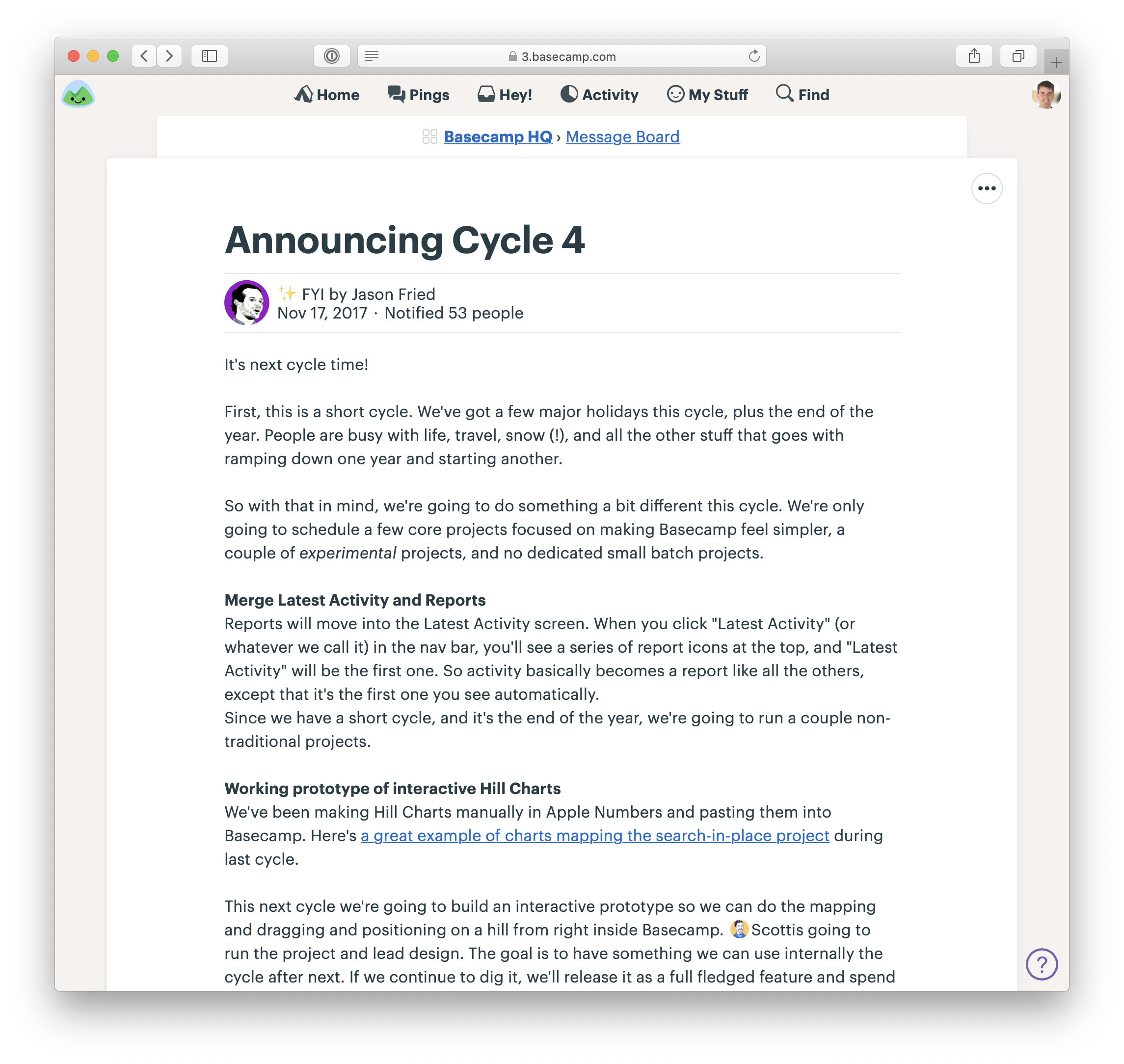 Jason announces the bets for the next cycle in the HQ—a Team in Basecamp that includes the whole company