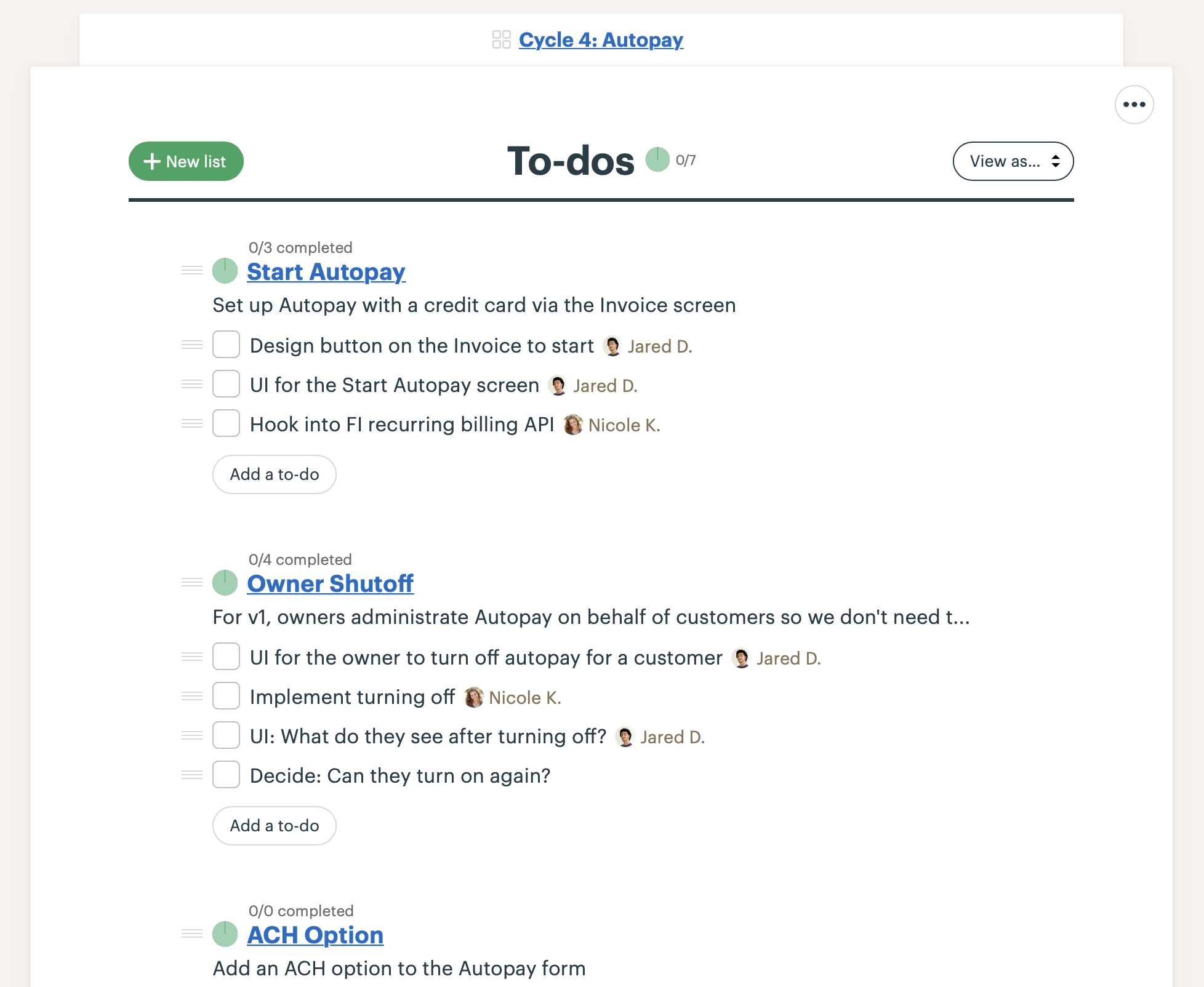 - Add design and programming tasks to each scope as To-Do Items. For example, “Start Autopay” has one task for design the UI and another task for wiring it to the existing recurring billing API. They can use the discussion thread on each To-Do Item to post updates or ask each other questions.