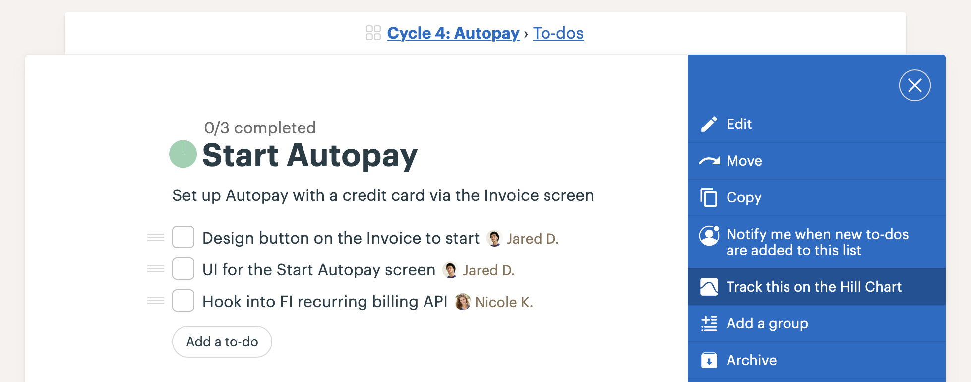 - Navigate to the To-Do List page for each scope and click the options menu (•••) in the upper right. Click “Track this on the Hill Chart.” That will display a Hill Chart at the top of the overall To-Dos section of the Project, with a dot corresponding to that scope (To-Do List).