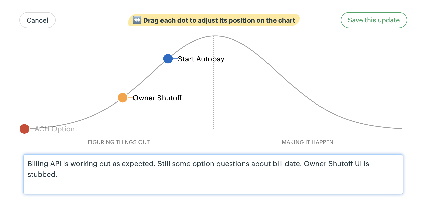 - Click “Update” on the Hill Chart and drag the dots to show progress from “unknown” to “known” to “done.” Use the annotation feature to add commentary when necessary.